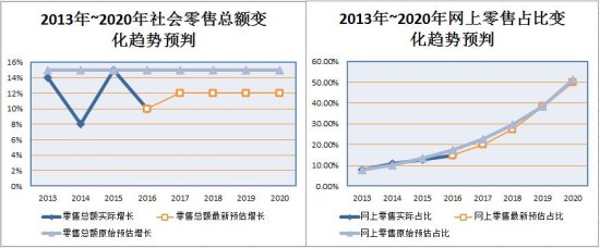 如上圖,我們將全球經(jīng)濟環(huán)境和國內(nèi)消費疲軟帶來的負面影響,傳統(tǒng)零售觸網(wǎng)后帶來的正面影響都考慮進來,將中國零售總額的平均增長率暫時約定為12%,可以推算出2020年零售總額將達到約52萬億元。