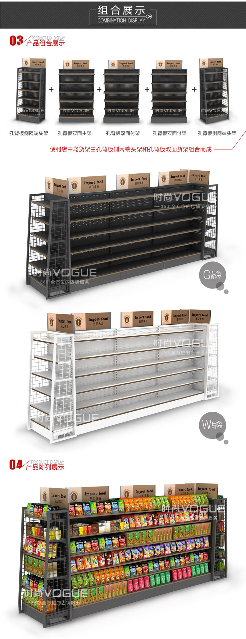 【描述】此款便利店貨架是時尚貨架為便利店食品展示區設計生產的一款洞洞板樣式的便利店單面貨架。該貨架采用優質冷軋鋼,采用先進的一體成型工藝制作,全程無焊點,承重力強,質量可靠。采用組合式設計、托壁可以直接卡在立柱上,安裝方便、造型簡約,經久耐用,是一款非常適合社區便利店使用的便利店貨架。此款孔背板端頭架可以和孔背板雙面貨架組合成一套便利店孔背板中島貨架。