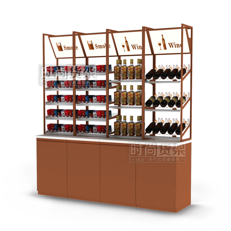 【描述】此款便利店貨架是時尚貨架為便利店收銀區設計的而一款收銀臺煙酒架。它由便利店煙架便利店白酒架收銀臺紅酒架組合而成。便利店煙酒架立柱采用優質鋼材,具有很好的承重能力。頂部配有磁吸燈箱廣告牌,即可宣傳品牌,又可以指引顧客,讓整個收銀區的工作效率顯著提高。此款收銀區煙酒架是框架式結構,可以直接放置在收銀背柜上,穩定性和安全性很好。